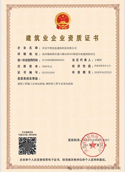 5月26日,河北中鐵滄鹽建筑科技有限公司成功實現(xiàn)了資質(zhì)證書的升級,資質(zhì)類別及等級正式提升為建筑工程施工總承包貳級、鋼結(jié)構(gòu)工程專業(yè)承包貳級。